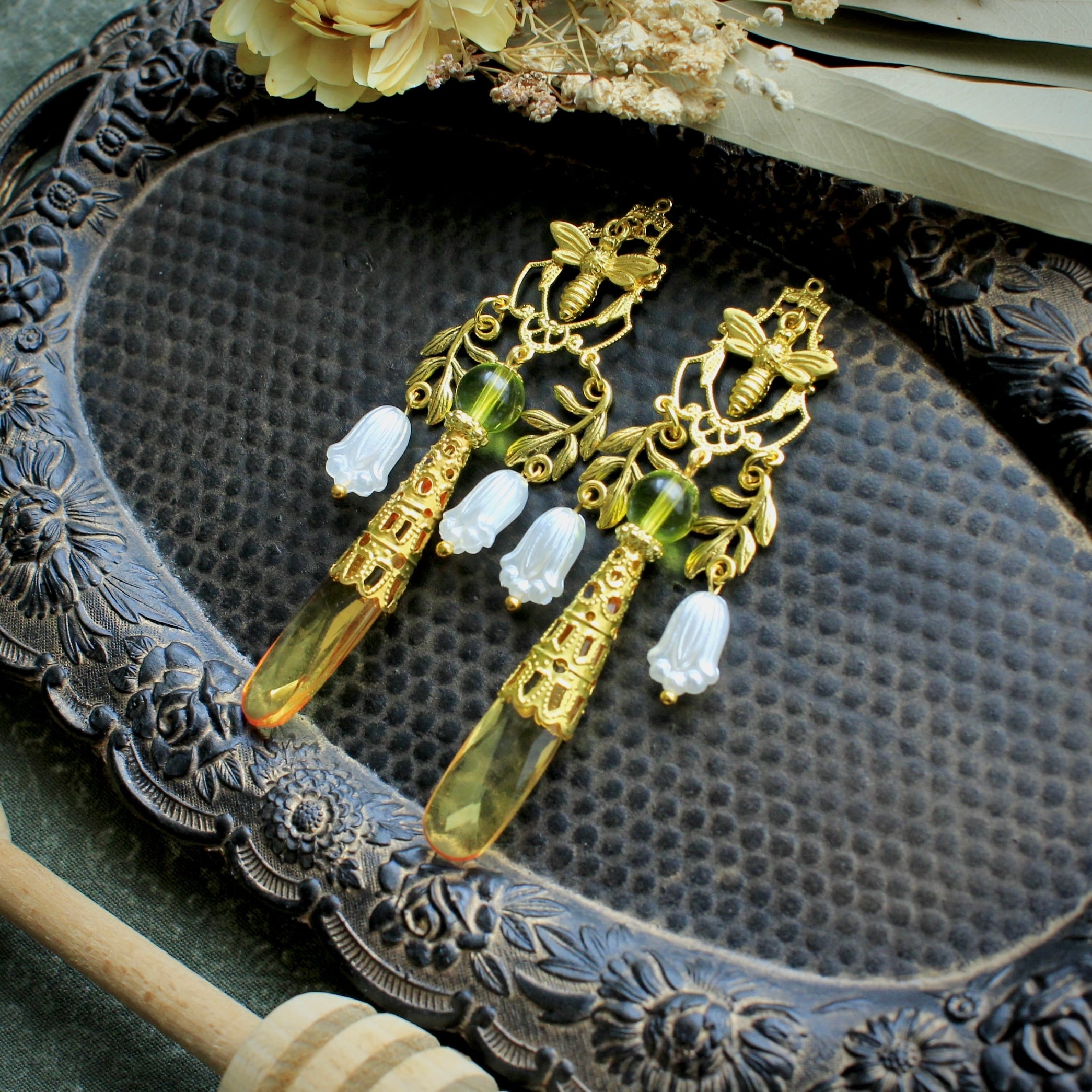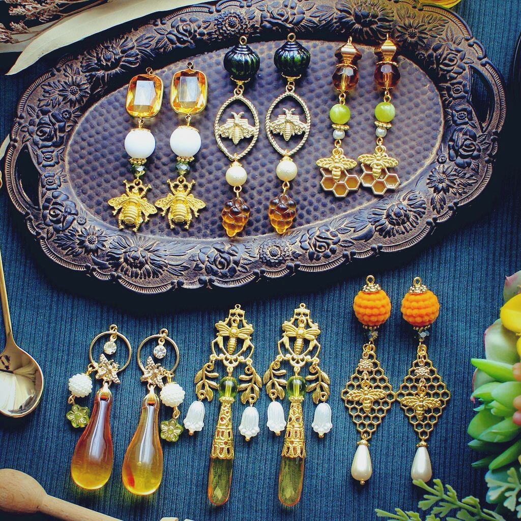 forbidden ドロップビーズに花とハチが揺れるチャーム・イヤリング・ピアス 空中庭園のTea Shop