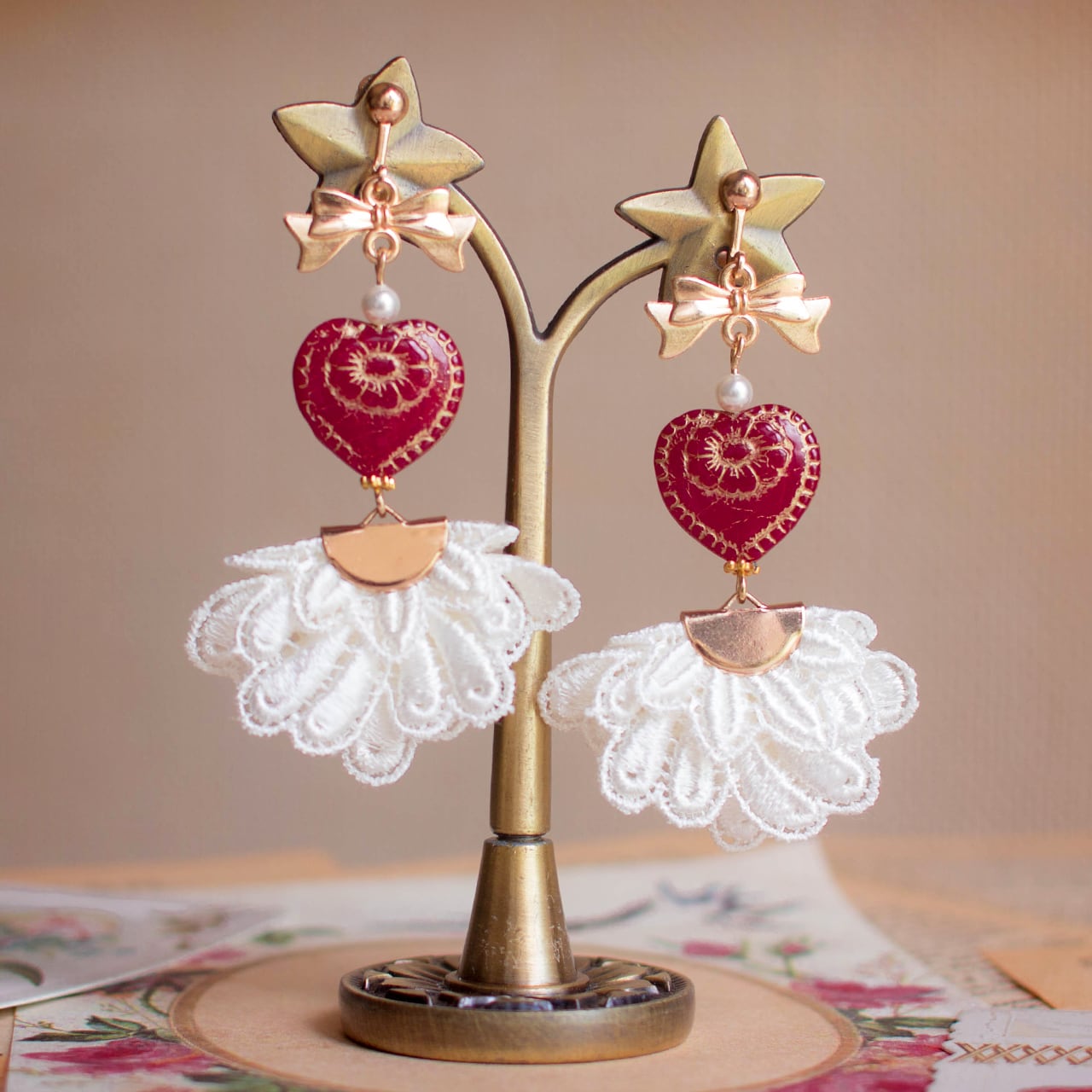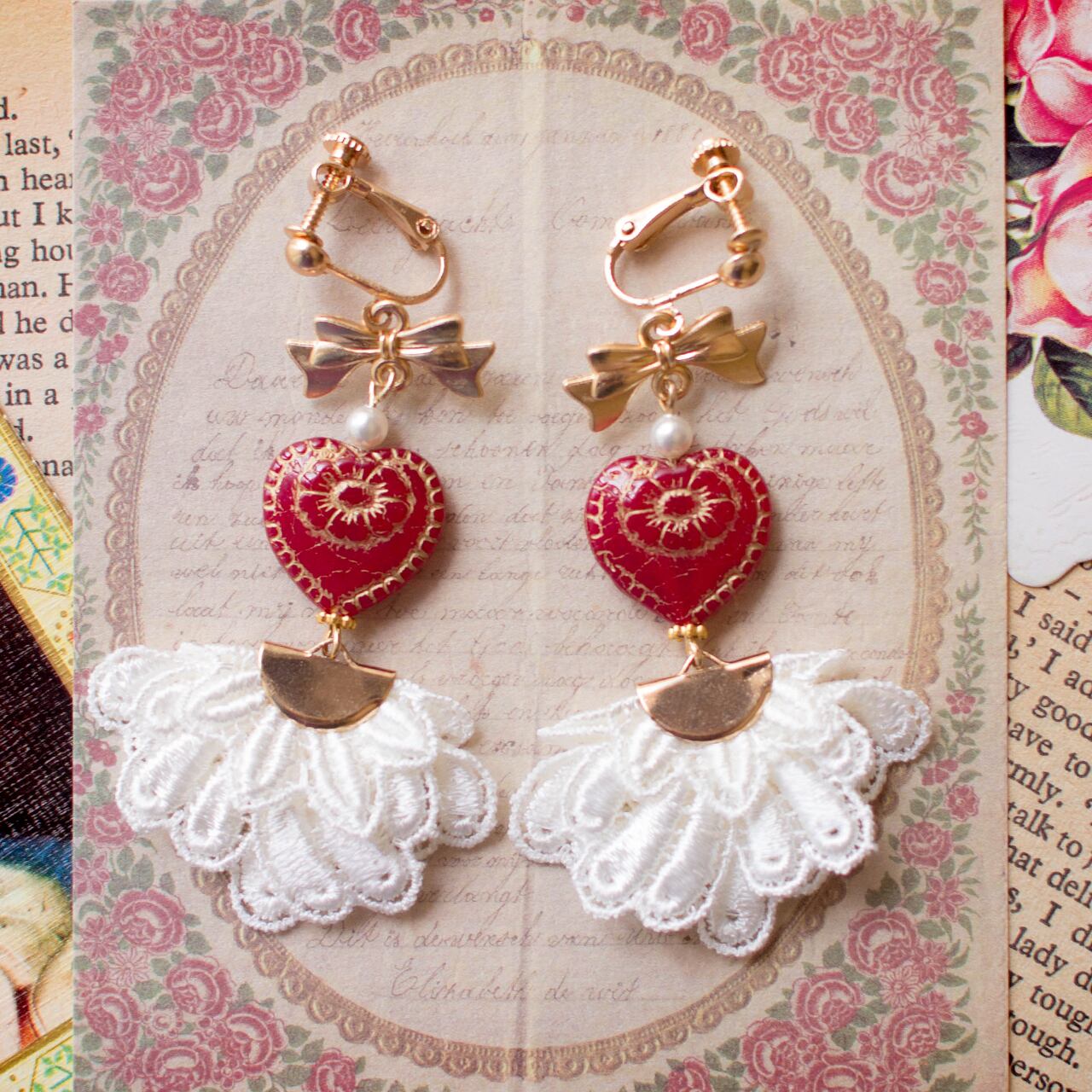 愛しの鼓動 レースモチーフが揺れるリボンとハートのチャーム・イヤリング・ピアス subrmight 乳母の子守歌