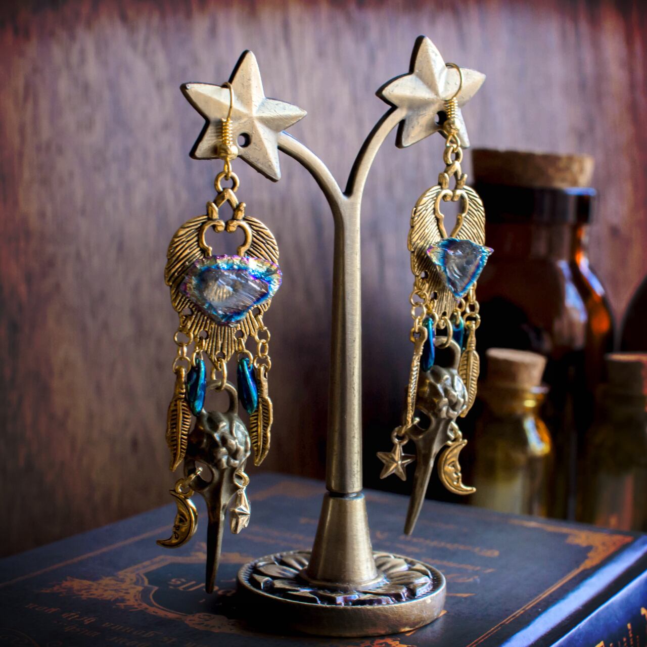 コレクション自慢 天然石クオーツクリスタルとチェコビーズが揺れるチャーム・イヤリング・ピアス subrmight 東西の魔女の使い魔