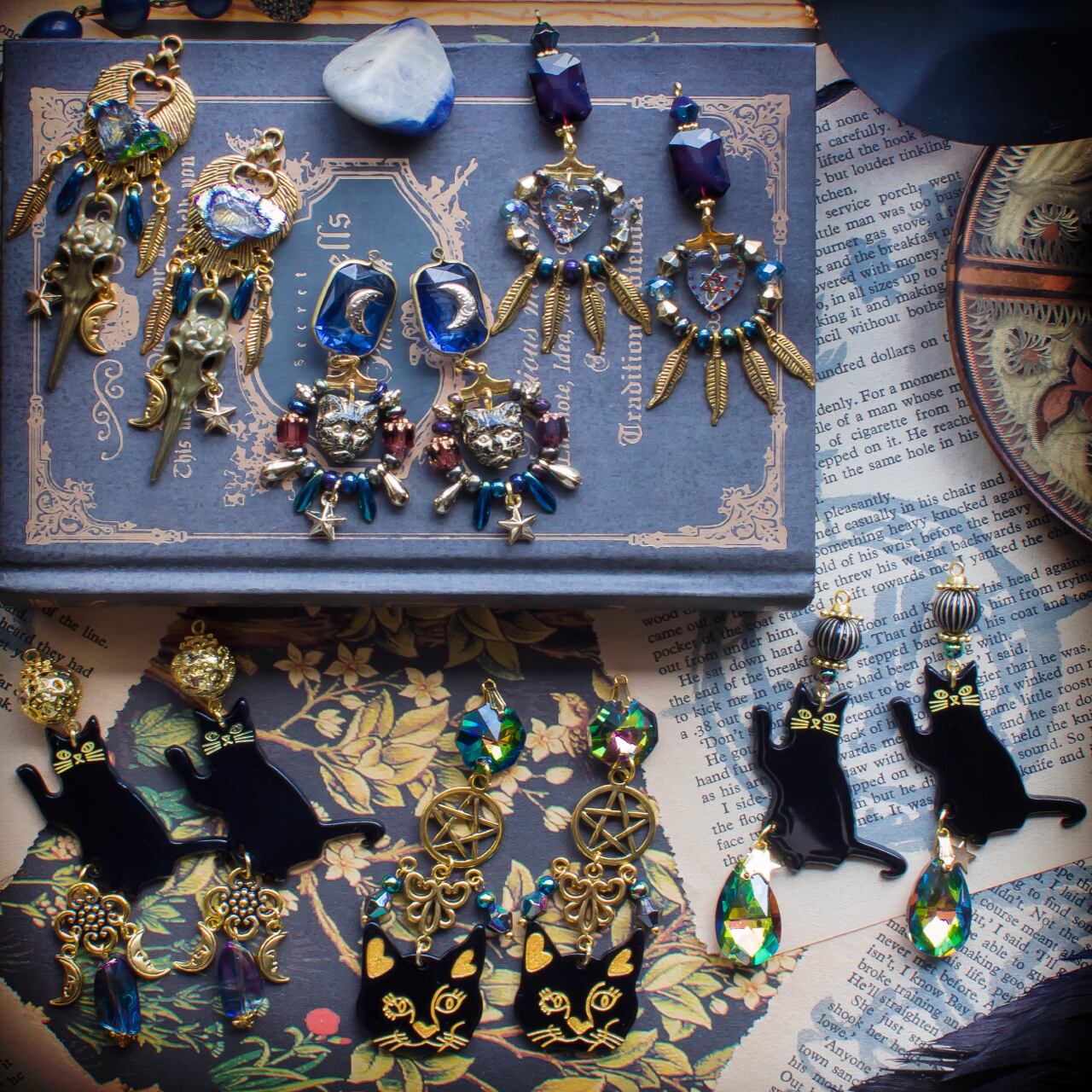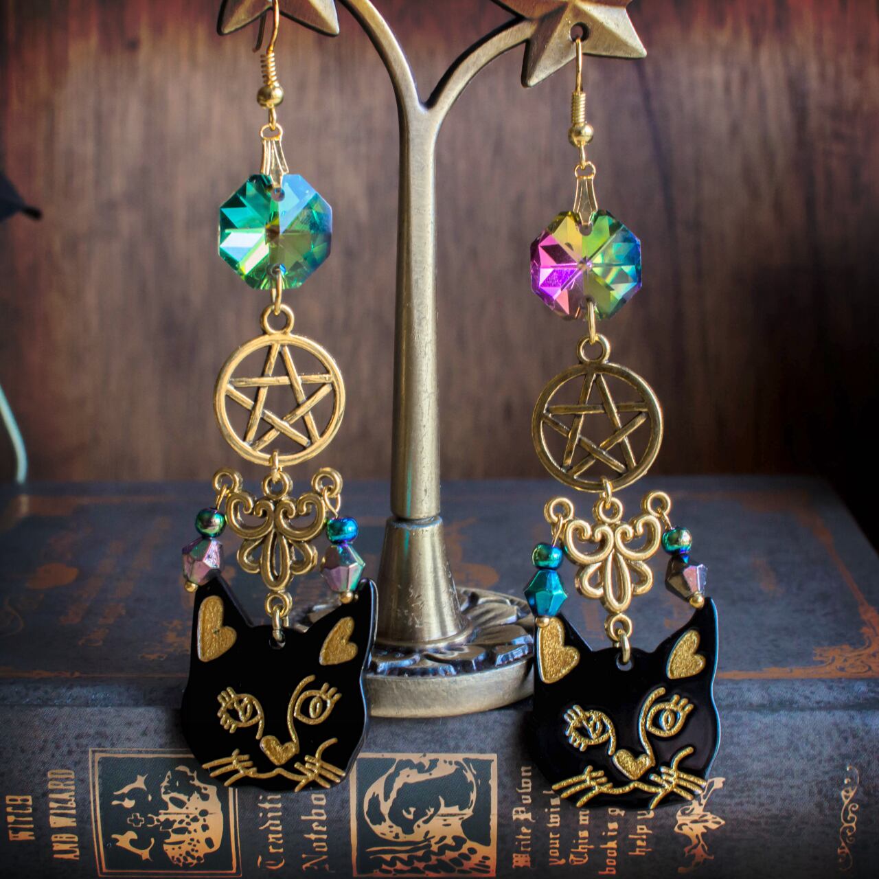 存在感のある黒猫モチーフがサイドのオーロラビーズと揺れ