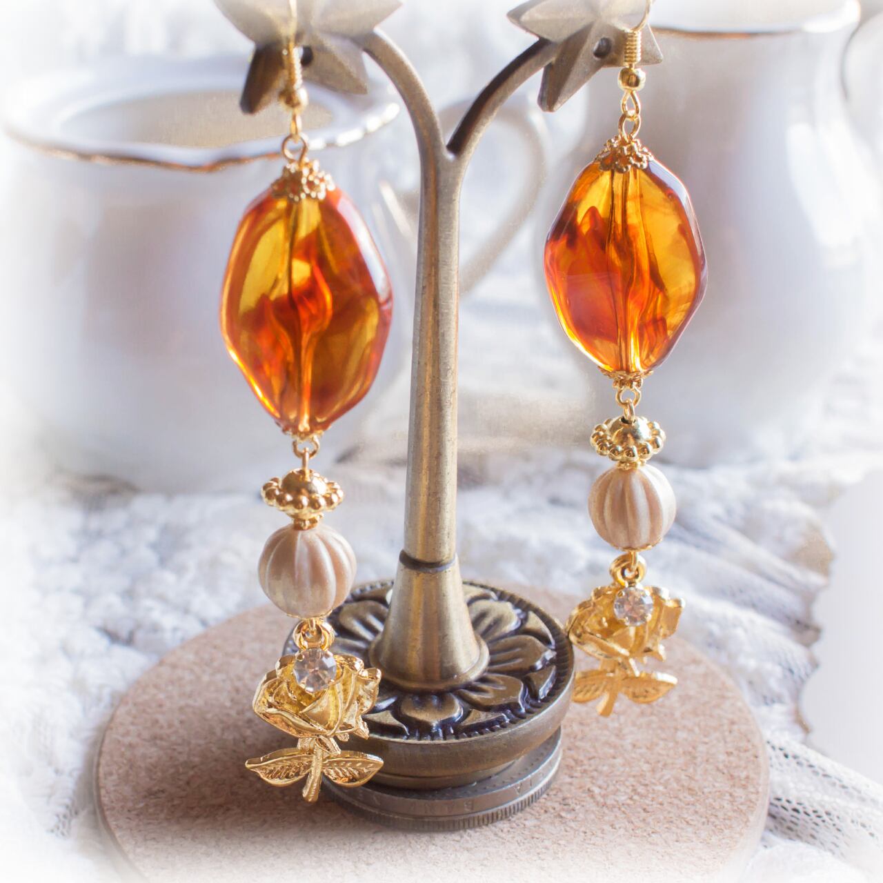 紅茶をイメージした存在感のあるパーツから揺れる一輪の薔薇までスッキリとしたデザインでまとめ幅広いファッションで使いやすいアイテムに♪