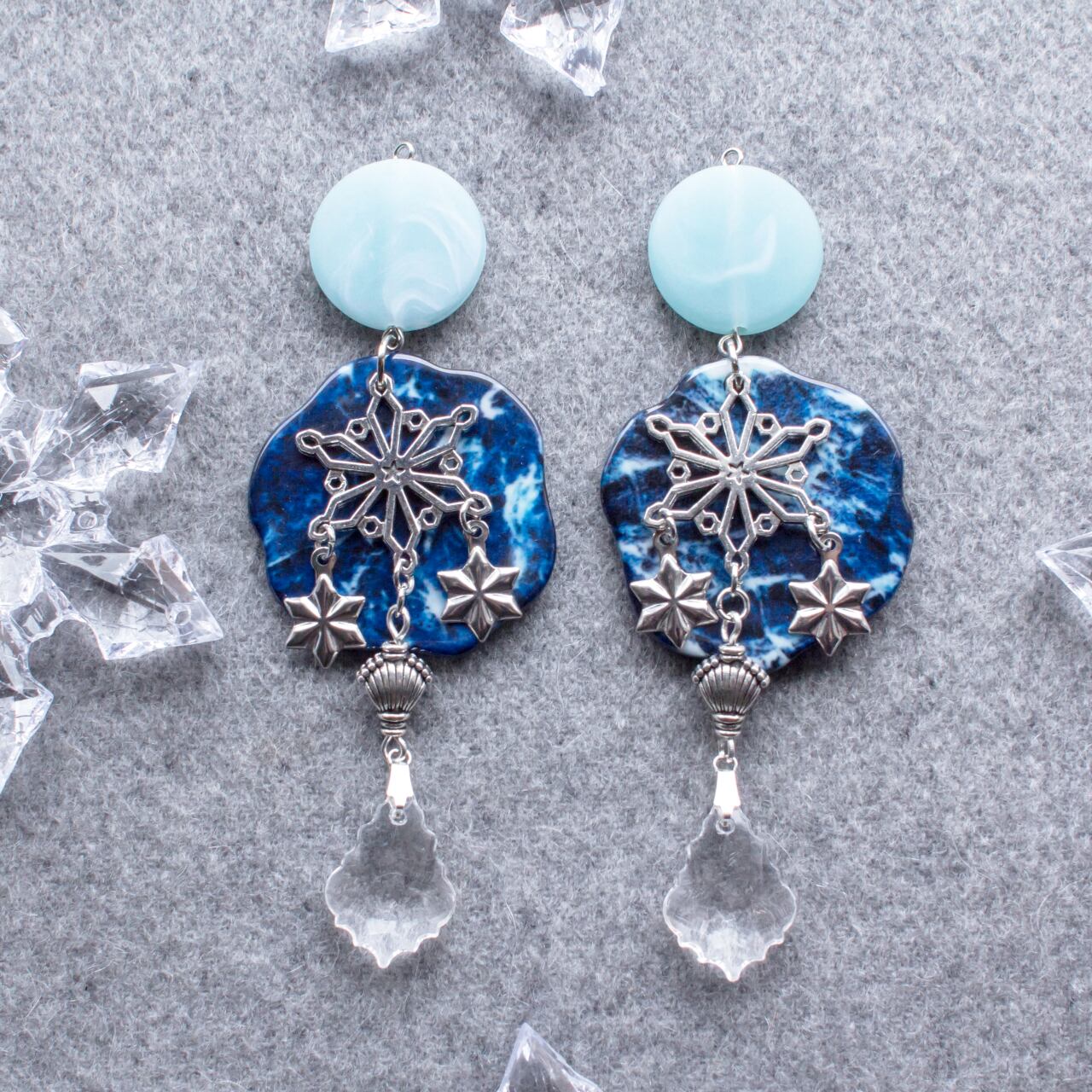 氷上の銀花 存在感のあるパーツと雪の結晶が揺れるチャーム・イヤリング・ピアス subrmight 湖に眠る城