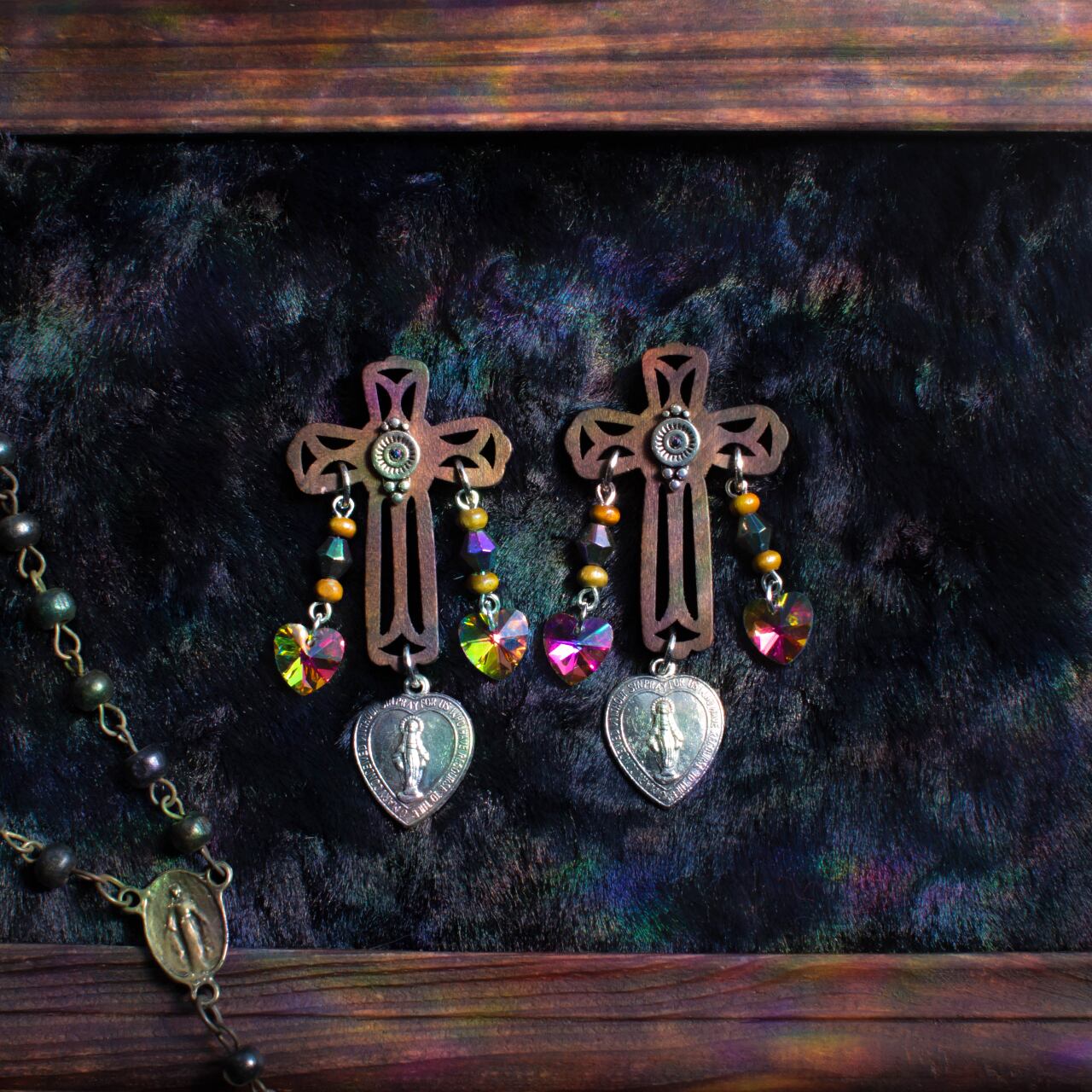 異端とバラク クロスのウッドパーツに虹色に輝くハートのチャーム・イヤリング・ピアス subrmight 赦しの秘跡と朔