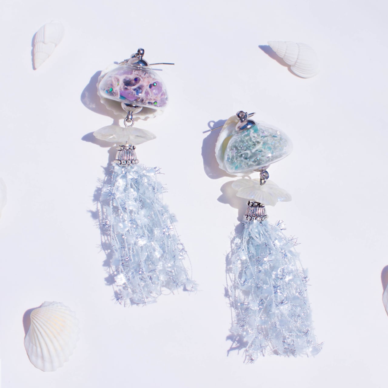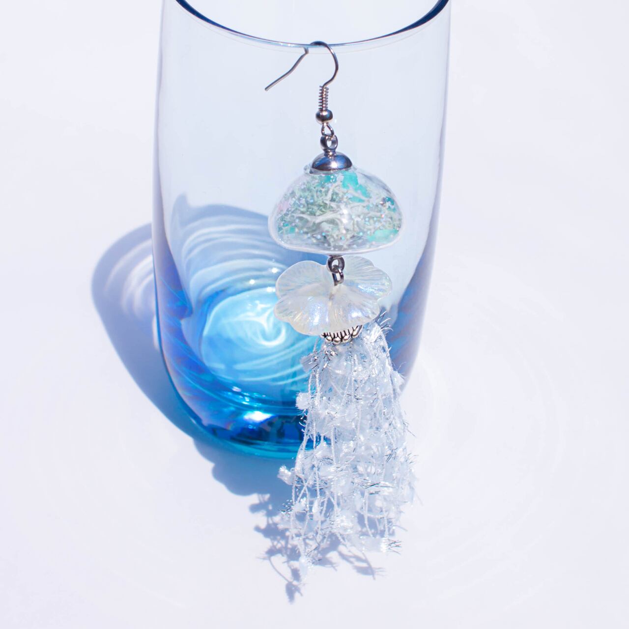 真夜中の展望 大きなクラゲが揺れるシルバーチャーム・イヤリング・ピアス 珊瑚は空に憧れて