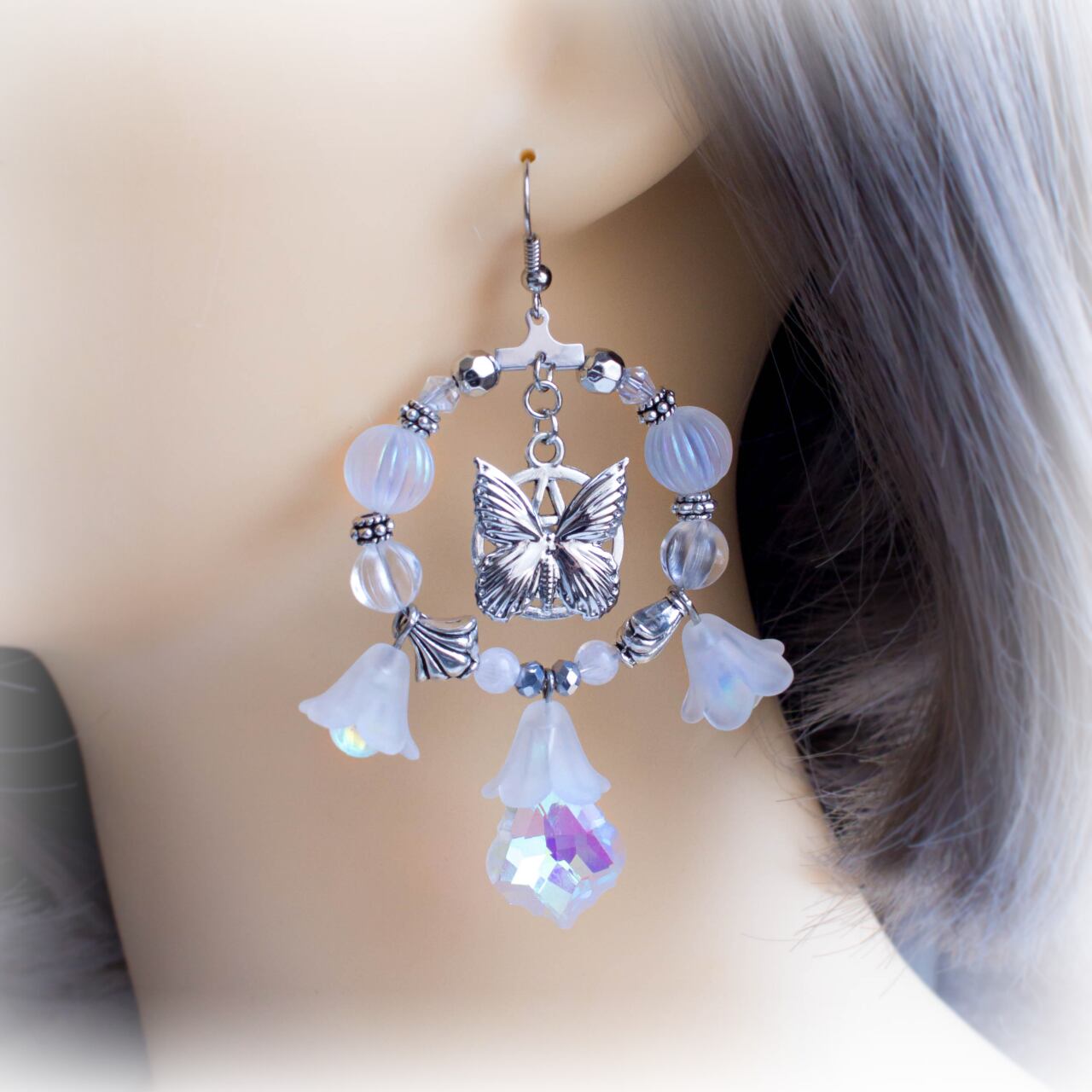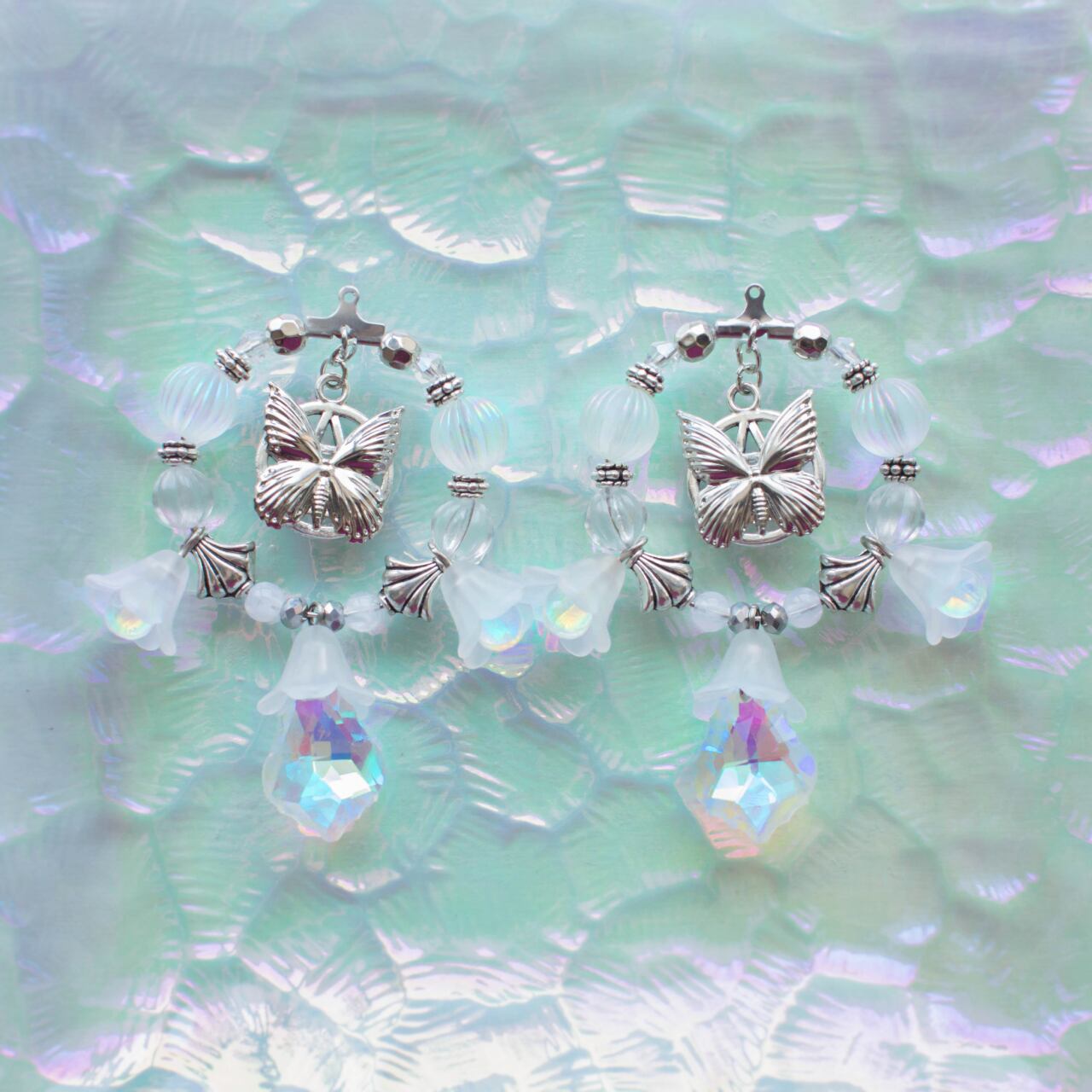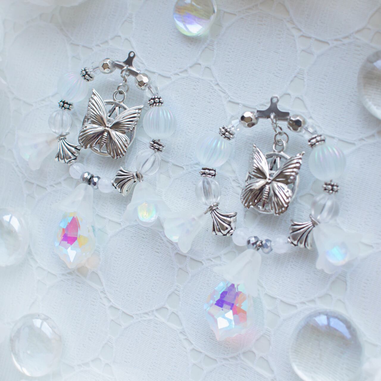 白雨の音 オーロラに輝く大粒のガラスに花と蝶が揺れるフープチャーム・ピアス・イヤリング 天泣に鳴る雨音