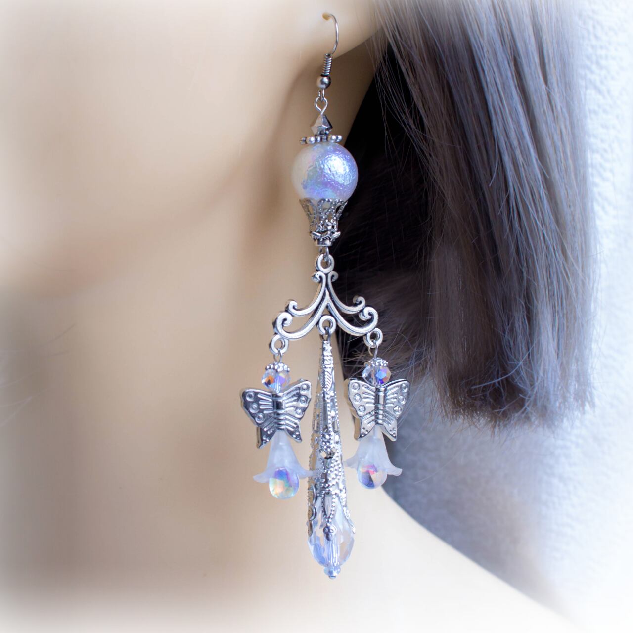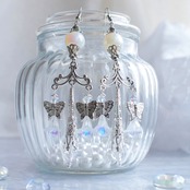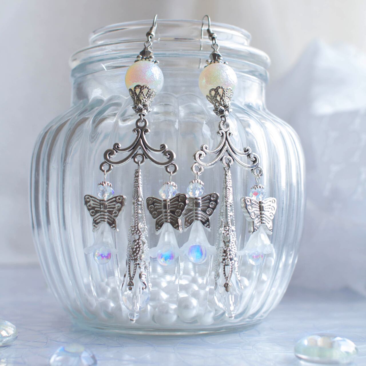 涙雨の音 オーロラに輝く大粒のパールに雨粒と蝶が揺れるチャーム・ピアス・イヤリング 天泣に鳴る雨音