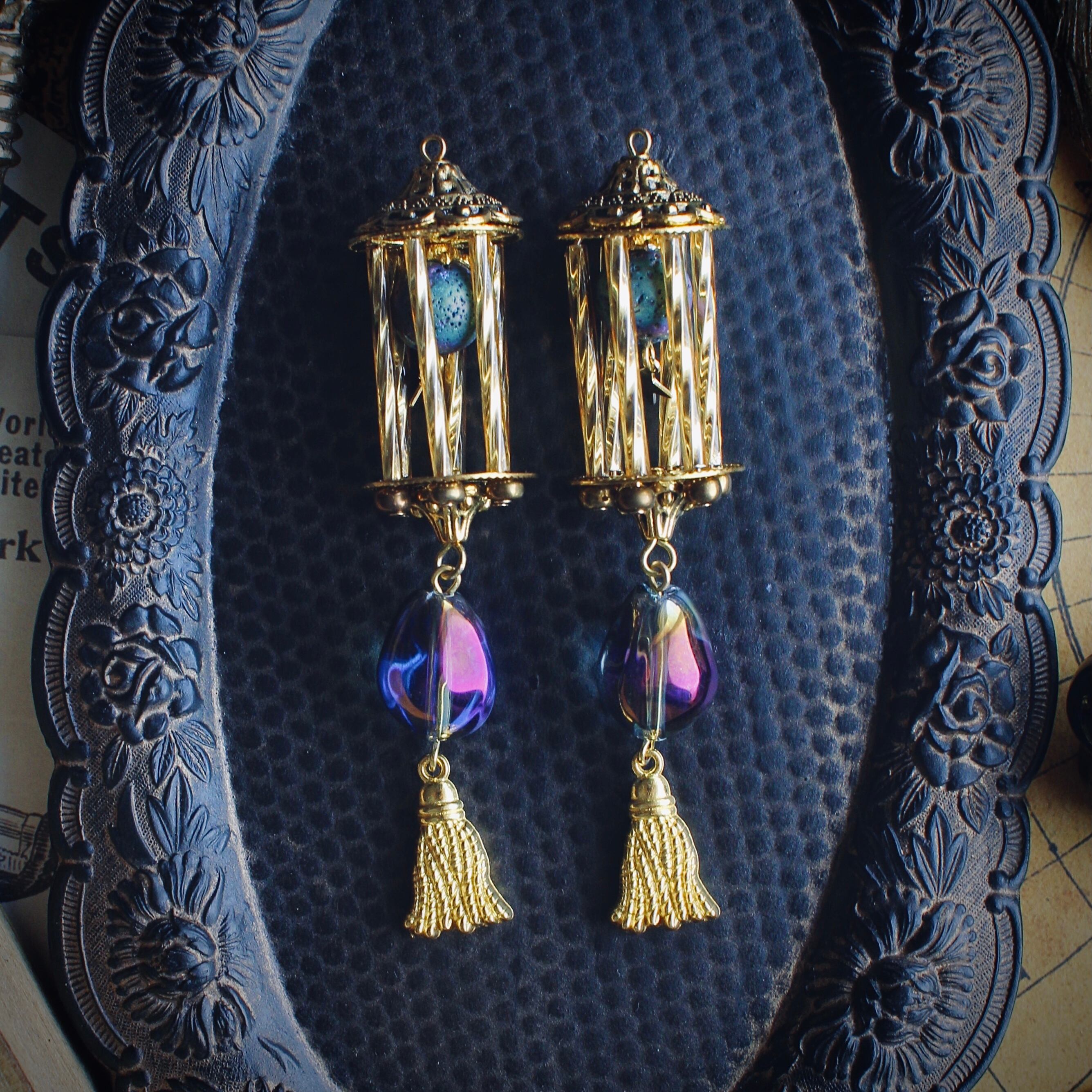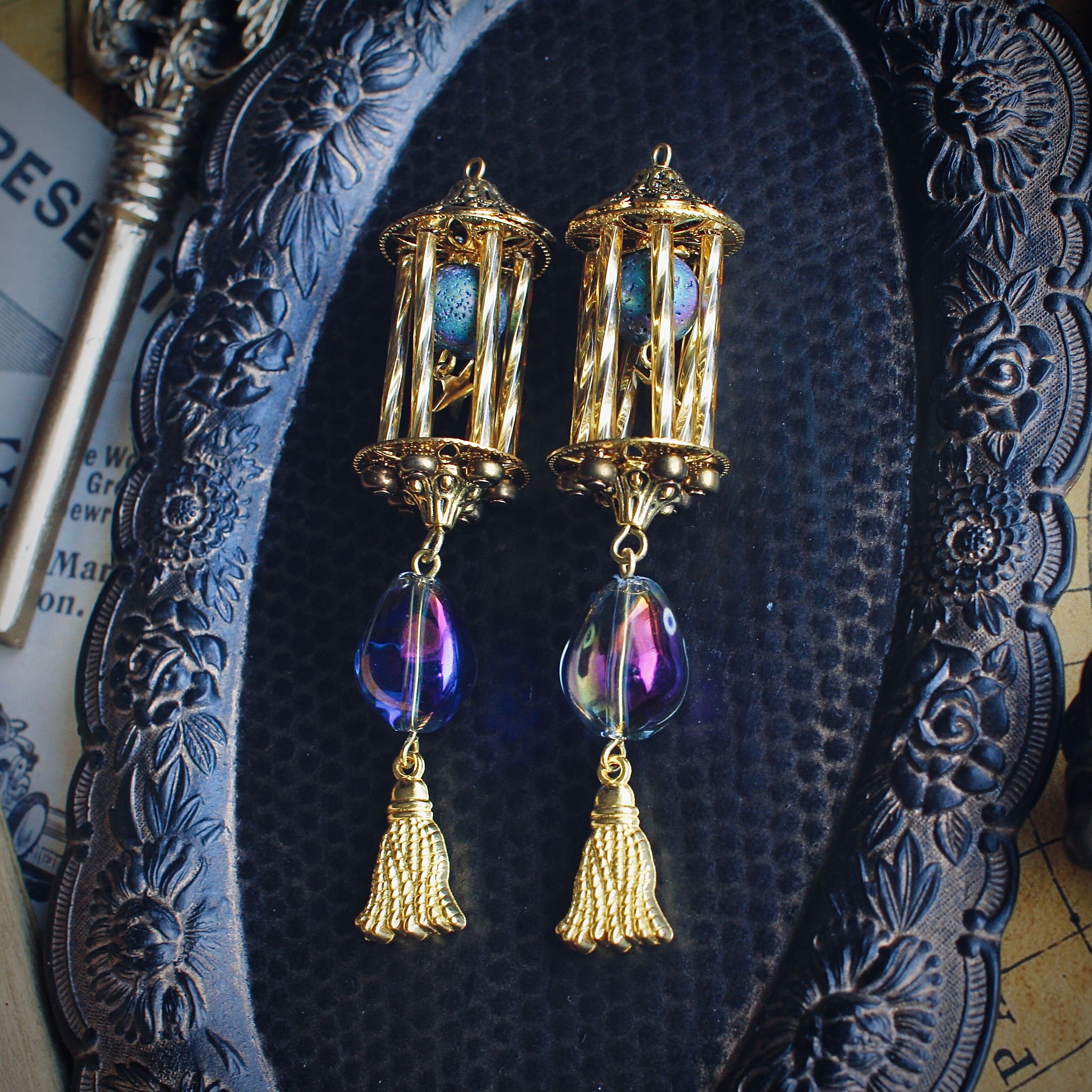 メテオールランプ 天然石と大粒ガラスビーズのグラデーションが美しい揺れるタッセルチャーム・ピアス・イヤリング Hermes antique