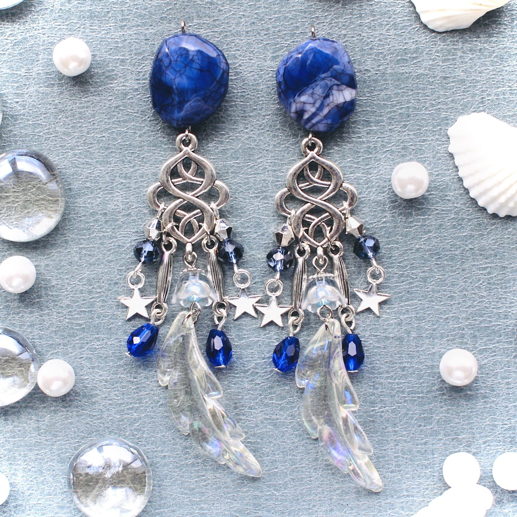 波間の祈り ブルー×シルバーにオーロラの羽が揺れるチャーム・ピアス・イヤリング 波花の子守り唄